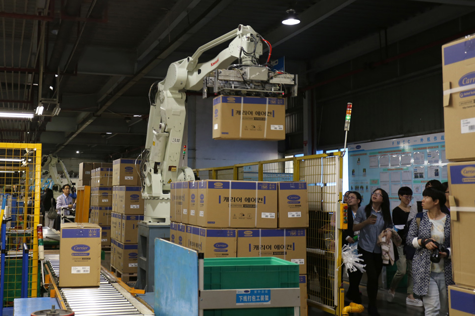 現(xiàn)在的空調(diào)生產(chǎn)線(xiàn),出現(xiàn)的已不再是擁擠忙碌得跟陀螺似的產(chǎn)業(yè)工人。因?yàn)椴簧俚?span lang="EN-US">“機(jī)器手”、“機(jī)器人”的出現(xiàn),勞動(dòng)密集型的家電制造工廠(chǎng)被賦予了全新的“科技感”和“智能化”的色彩。在空調(diào)室內(nèi)、外機(jī)總裝線(xiàn)體的末端,裝箱、打包等繁重環(huán)節(jié),早已被機(jī)器人所取代。當(dāng)成品從生產(chǎn)線(xiàn)上完成之后,也是通過(guò)機(jī)器手直接搬運(yùn)到流轉(zhuǎn)板上。